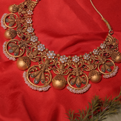 Discover timeless elegance with the Antique Floral Heritage Necklace Set, masterfully designed by Santosh Jewellers. This handcrafted piece showcases intricate filigree floral patterns in antique gold, complemented by brilliant crystal embellishments and delicate red stone highlights. The necklace is paired with matching earrings that echo the same royal craftsmanship and charm.