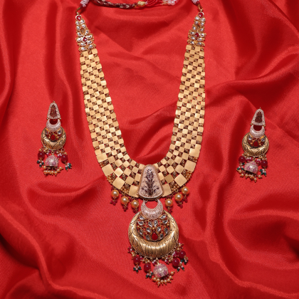 Celebrate royal tradition with this Antique Gold Crescent Bridal Necklace Set, beautifully handcrafted by Santosh Jewellers. The necklace features a unique chequered gold pattern highlighted with exquisite red meenakari detailing, pearl drops, and intricately carved motifs. The centerpiece showcases a crescent-shaped pendant symbolizing grace and strength, accompanied by perfectly matched statement earrings.