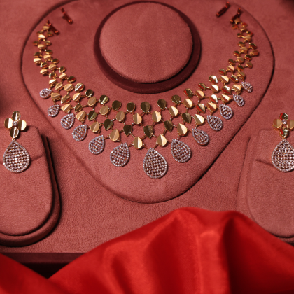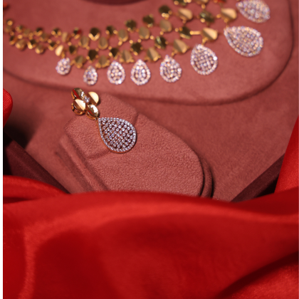 Each teardrop is meticulously paved with dazzling crystals, creating a rhythmic pattern of brilliance. The accompanying earrings mirror the necklace’s fluid design — making this set an ideal choice for cocktail evenings, festive celebrations, or bridal soirées.