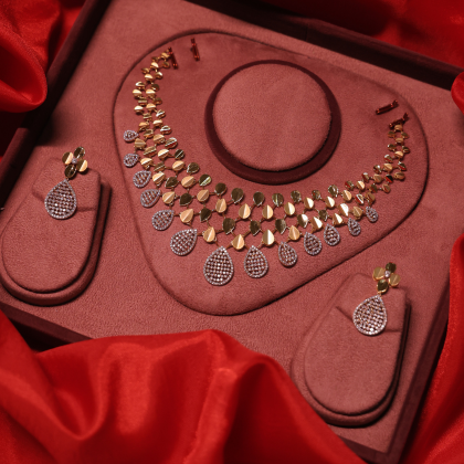Grace meets glamour in this Diamond Teardrop Dual-Tone Necklace Set by Santosh Jewellers. Designed with alternating teardrop motifs in radiant gold and shimmering silver tones, this masterpiece strikes the perfect balance between tradition and modernity.
