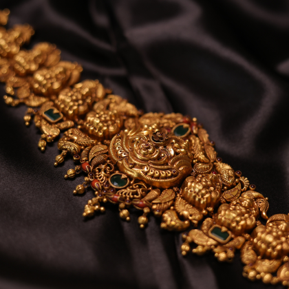 The Divine Lakshmi Temple Gold Vanki Bracelet by Santosh Ji Jewellers is a masterpiece of traditional South Indian artistry. Handcrafted in 22K antique gold, it showcases intricate carvings of Goddess Lakshmi surrounded by celestial motifs and temple-inspired patterns. Studded with emerald and ruby stones, this regal bracelet embodies blessings, prosperity, and divine grace. The heritage design is perfect for bridal wear or festive adornment, symbolizing strength and spirituality through exquisite detailing. Every contour of this Vanki-style creation reflects the timeless craftsmanship that has defined Moradabad’s golden legacy for generations.