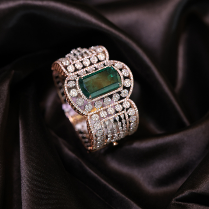 The Emerald Radiance Diamond Cuff Bracelet by Santosh Ji Jewellers defines modern royalty. Crafted in 18K gold, this masterpiece features a bold, rectangular emerald centerpiece surrounded by shimmering brilliant-cut diamonds arranged in a captivating filigree pattern. Its wide cuff silhouette brings together strength and sophistication, perfect for those who appreciate statement elegance. The interplay of lustrous diamonds and the deep green gemstone evokes timeless luxury, reflecting the heritage artistry of Moradabad’s master jewellers. Whether paired with couture ensembles or classic evening wear, this bracelet adds an unforgettable sparkle to your story of style and power.