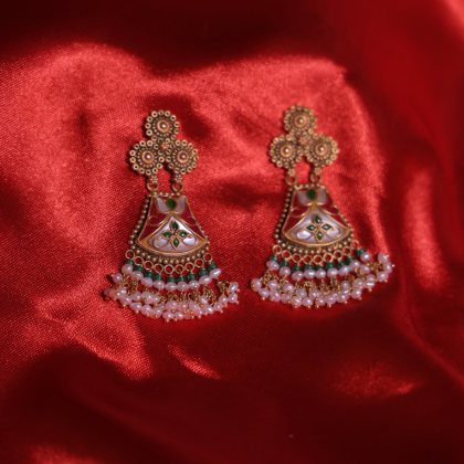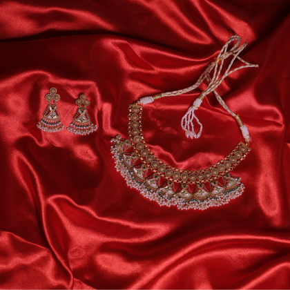 The matching earrings mirror the same artistry, creating a complete traditional ensemble perfect for weddings, festive events, and elegant soirées. This set harmoniously blends timeless heritage with contemporary grace.