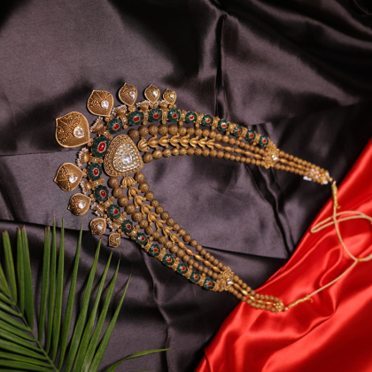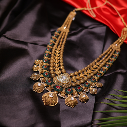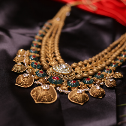 The Royal Peacock Bridal Gold Necklace Set from Santosh Ji Jewellers captures the grandeur of traditional Indian heritage with a modern regal twist. Expertly handcrafted in gold, this masterpiece features intricate peacock motifs, layered detailing, and kundan-inspired centerpieces accented with red and green enamel work. The matching jhumkas complete the ensemble, adding elegance and grace to every bride’s look. Each piece radiates antique charm and unmatched craftsmanship, making it perfect for weddings, festive celebrations, and heirloom collections. Designed in Moradabad, this set embodies the essence of luxury, culture, and devotion in every curve.