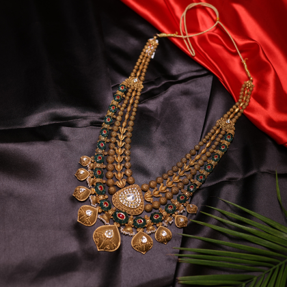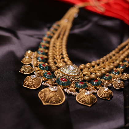 The Royal Peacock Heritage Gold Necklace by Santosh Ji Jewellers is a breathtaking creation inspired by regal Indian artistry. Handcrafted in pure gold, this masterpiece features intricate peacock and floral motifs adorned with red and green enamel detailing. The layered pattern, accented with pearl drops and antique finish, exudes an aura of timeless sophistication. A brilliant centerpiece with a kundan-style stone enhances its grandeur, making it an ideal choice for brides and special occasions. Designed to complement traditional and festive attire, this necklace captures the beauty of heritage craftsmanship and modern luxury in perfect harmony.